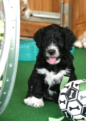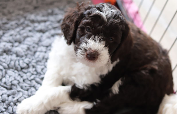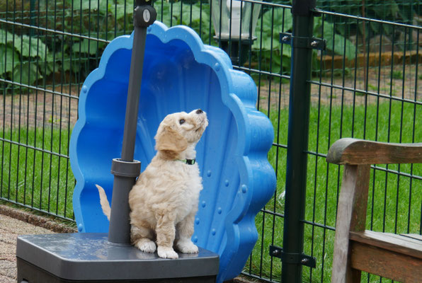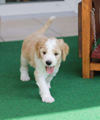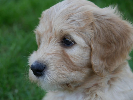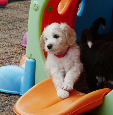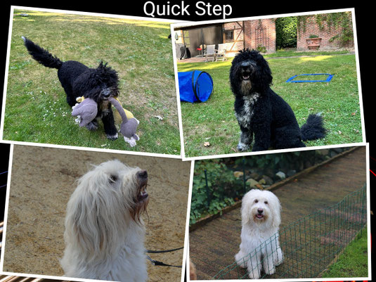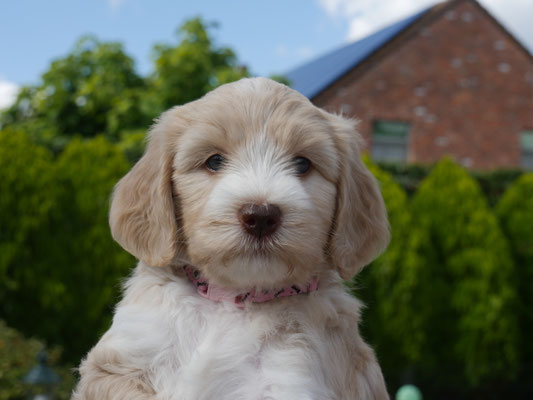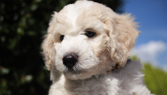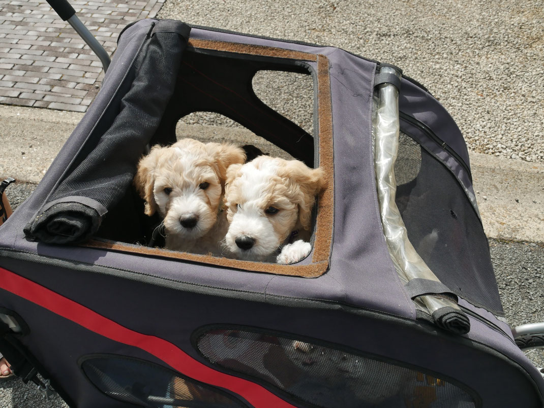 Zandkleurige pups in verschillende tinten...net zoals Blanche toen ze klein was. Chaussette's Yoko Fiesta (het bruine teefje) en Chaussette's Yolo PomPom (het zwart teefje) maken het plaatje gans compleet...