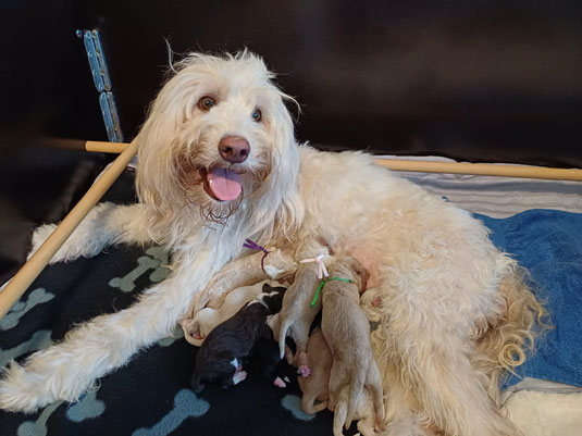 Probleemloos heeft Blanche in 20 minuten tijd, de eerste 4 pups ter wereld gebracht....onverwachts kwamen er niet 2 maar nog 4 pups achter....